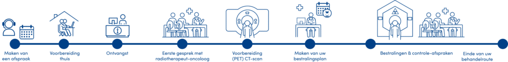 U bent door uw arts doorverwezen naar ons. Een spannende tijd breekt aan. Het kan in zo’n geval fijn zijn als u weet wat u kunt verwachten. Op deze pagina vindt u onze behandelroute, van de voorbereidingen thuis en uw eerste gesprek tot de laatste bestralingsafspraak.